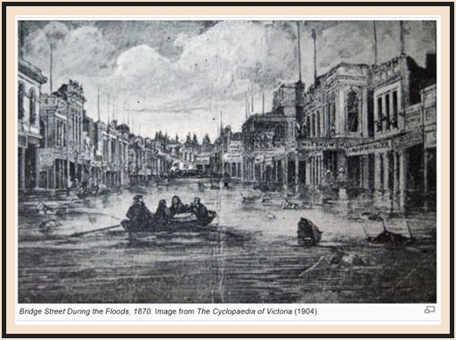 Late in October 1870 the worst of the frequent floods of the nearby Yarrowee River since Ballarat East was established, occurred. The Sutton store was built on sufficiently high ground to not be inundated, but the store’s backyard went under water. Years later, their son Alfred related how he had gone out foraging in the floodwaters at that time in the family’s bathtub.
