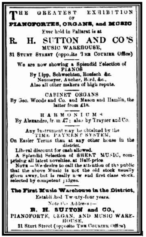 Alfred’s management style was somewhat more flamboyant than his father’s had been, although this probably was also a reflection of the more affluent times existing in the state of Victoria. As well as the trade in musical instruments, the Sturt Street store made itself available for the sale of tickets to local concerts and other community events, which no doubt fostered the entry of potential customers into their premises, and Suttons regularly advertised in the newspapers. In 1877 these ads contain, for the first time, references to “time payment” and “liberal discount for cash”.