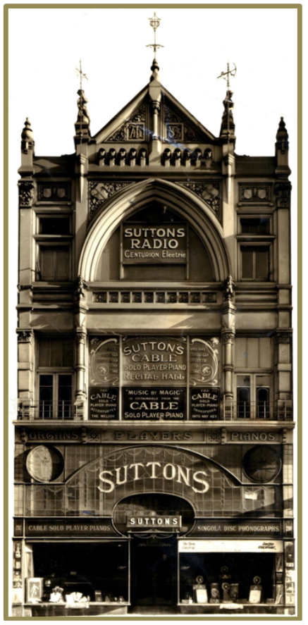 In Melbourne that same month, Henry Sutton noticed the premises almost next door to their current store was up for sale, and the vendor was willing to make “modifications to suit new owner”. The decision was taken to purchase the property and have the building altered to their requirements. These new premises at 290-292 Bourke St Melbourne [seen below] were occupied in October 1895, and the company remained there until 1938. Once again this new music warehouse was lavishly appointed, and included workrooms for the repair of musical instruments. By this time, the city store had become the centre of Suttons’ business, and was proudly claimed by them to be the “largest establishment of its kind in Australia”.