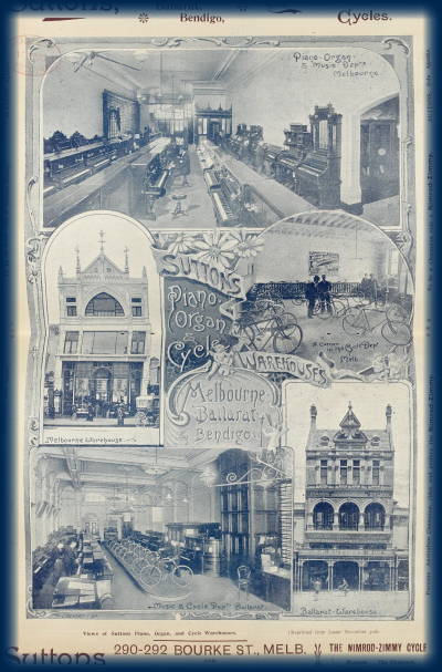Late 1895 Suttons began selling bicycles at all their stores, and the sale of these comprised a large portion of the company’s turnover at that time. Large departments within the Suttons stores to handle these goods were established, as can be seen in the below illustration dated 1895. Later that year Suttons  appointed a cycle shop manager – the later famous, Carl A. Schwaebsch, and in April 1897 he and Walter Sutton, along with Carl’s wife and 3 other men were the first to cycle through the Victorian Alps. Suttons ceased selling bicycles in 1899, as the craze faded.