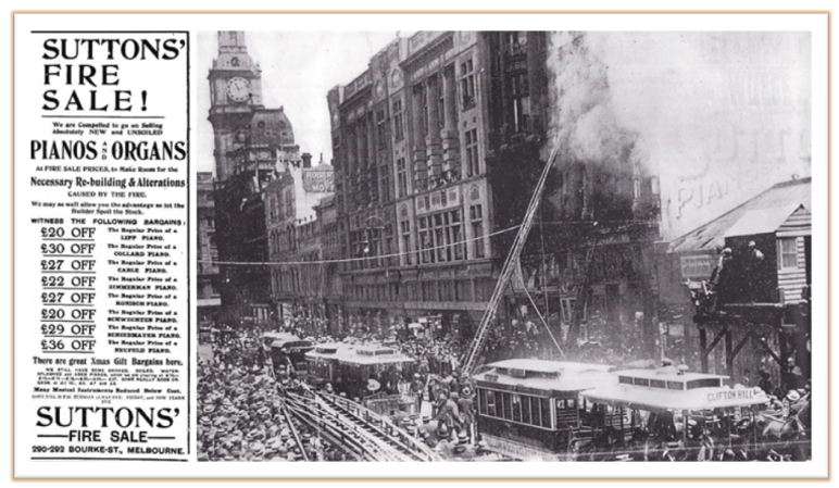 Late in November 1912 the Suttons store in Bourke Street Melbourne was affected by a fire on it’s two upper floors.