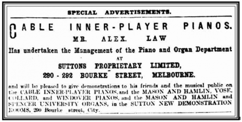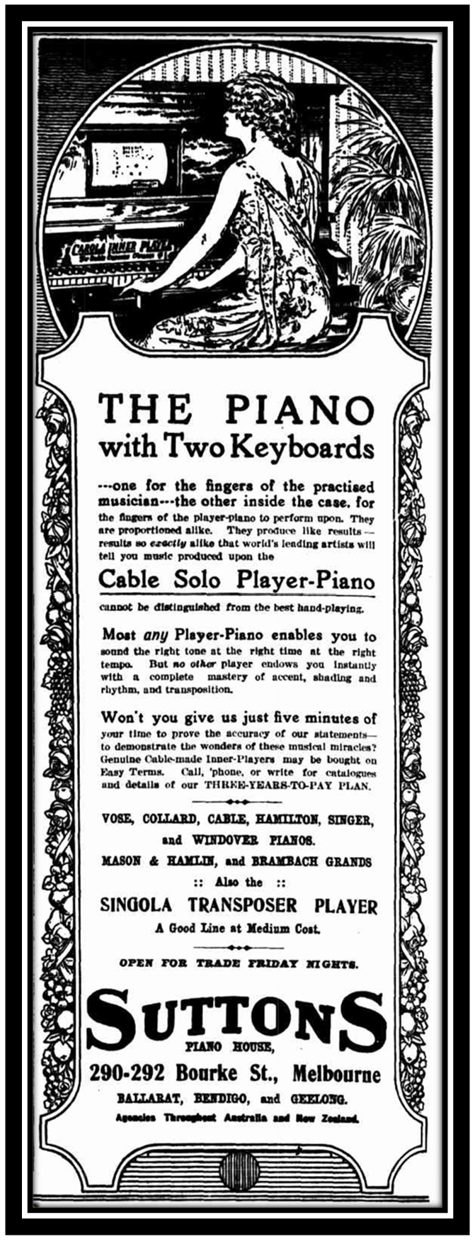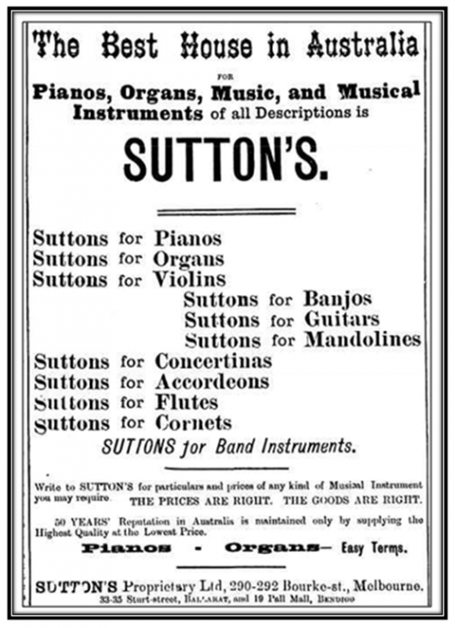Trade throughout the first decade of the 20th century was generally steady and untroubled, although in 1909 a piano tuner employed by Suttons to service the rural Daylesford district was found to have embezzled the company. The charge was reduced to larceny, and he was fined.