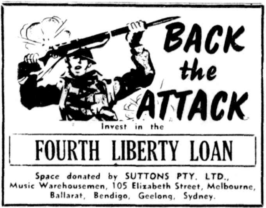 By 1942 the Australian government was running short of money to continue building defences to protect the country from its approaching enemies. It instituted a series of “Liberty Loans” which asked the Australian people to subscribe funds to help in the defence of their homeland. Patriotically, Suttons Pty. Ltd. sponsored newspaper advertisements for these loans; in April 1943 Suttons donated £18,000, and a further £10,000 6 months later.