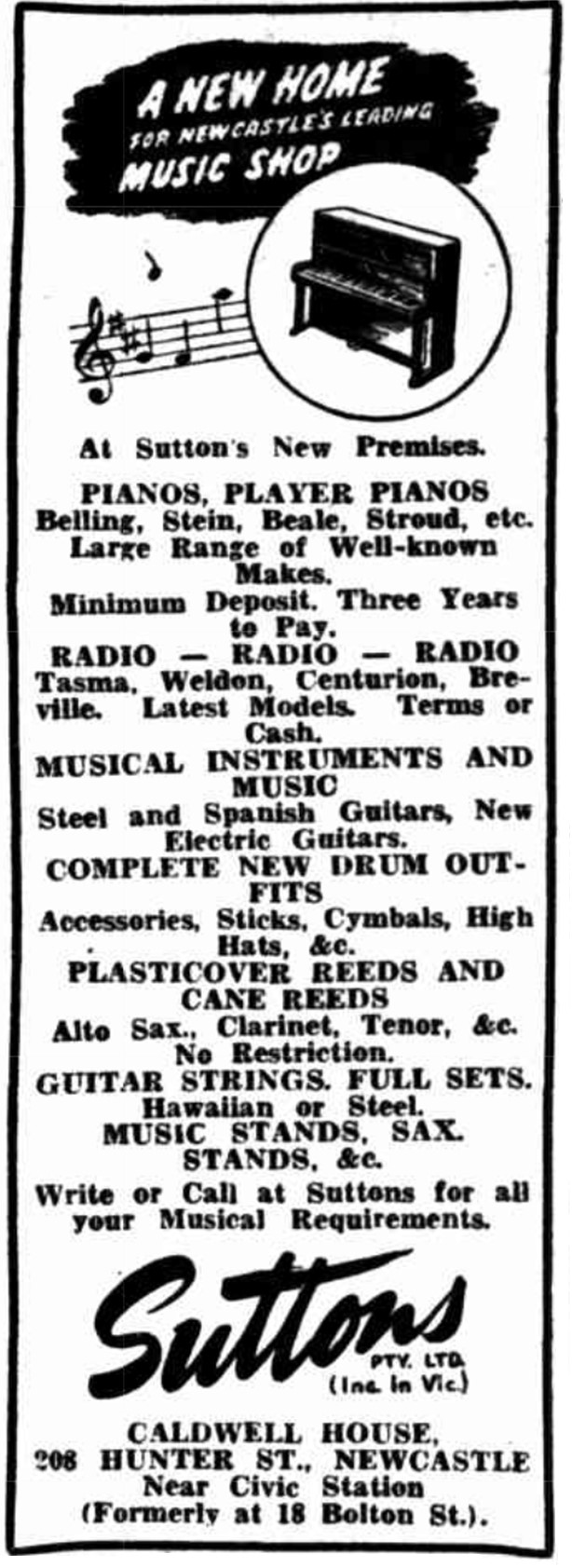 Late in 1944 both Douglas M.Jones (son of Violet Sutton & E.Gordon Jones) and Jeffrey A.Sutton (son of Stanley Sutton) were discharged from their war service and became available to take positions within Suttons’ management. Both young men were assigned roles in New South Wales : Douglas Jones was appointed as Manager/Accountant at the Sydney branch; Jeffrey Sutton to Newcastle to expand the agency which had been there since before the war. By mid August 1945 Jeffrey had opened a new retail store at 18 Bolton Street, Newcastle; early in the next year this branch had been moved to a more convenient location at Caldwell House, 208 Hunter Street, Newcastle.