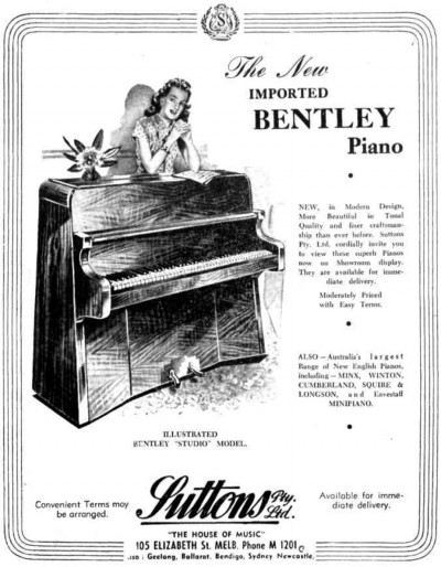 In mid 1948 supplies of modern small pianos – otherwise known as “miniature pianos” which had been made by British manufacturers – reached Suttons. These instruments were quite successful and proved to be of outstanding value, design, quality and excellent tonal quality.